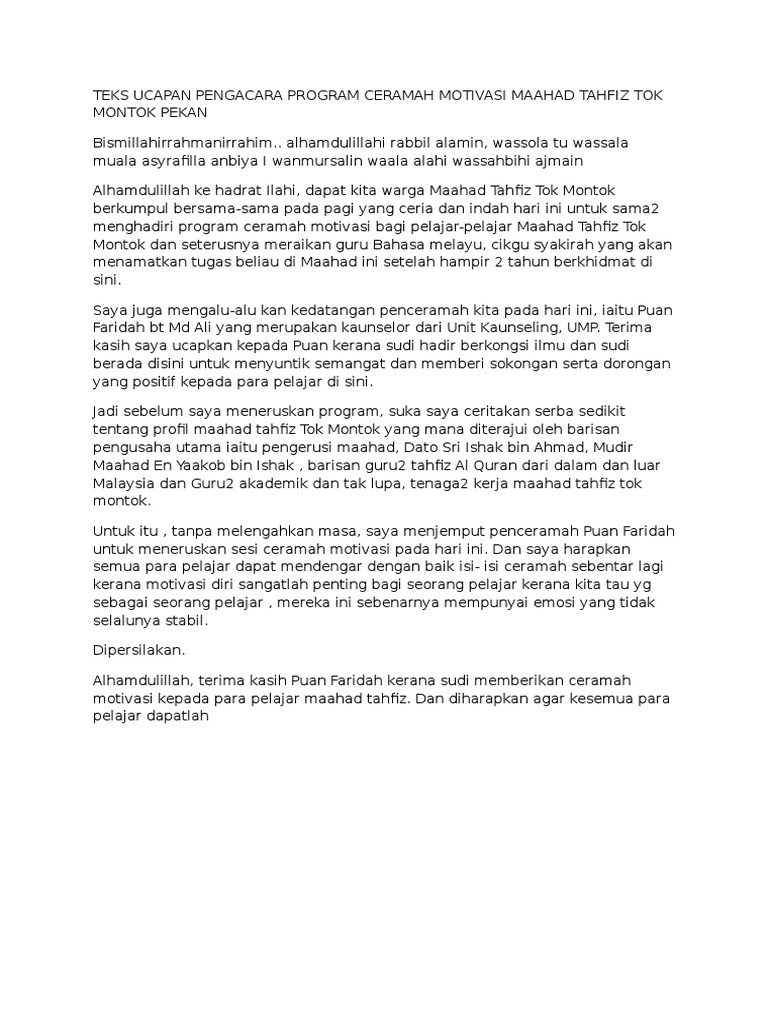 Teks Ucapan Pengacara Program Ceramah Motivasi Maahad Tahfiz Tok Montok Pekan