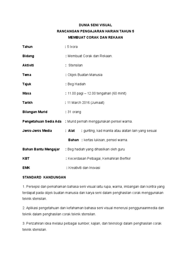 Rancangan Pengajaran Harian Psv Tahun 5 Stensil Dan Gosokan