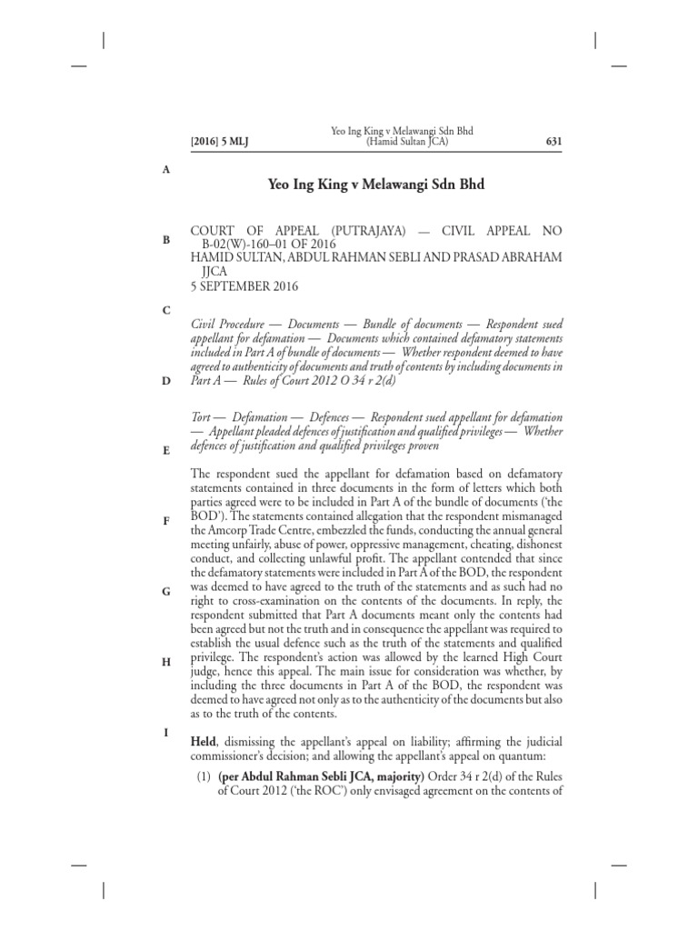 Ca 2016 5 Mlj 631 Yeo Ing King V Melawangi Sdn Bhd Lawsuit Evidence Law