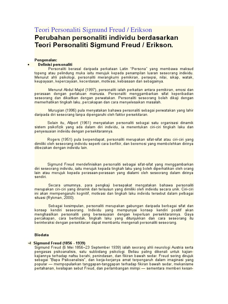 Sebagai kesimpulan dalam usaha membentuk personaliti yang diinginkan freud percaya cara didikan dan layanan yang diterima oleh individu semenjak kecil sangat mempengaruhi personaliti seseorang.