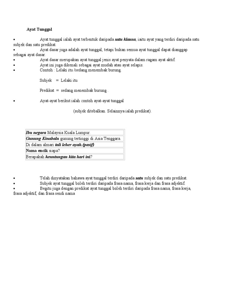 Ayat Tunggal Atau Ayat Dasar Juga Disebut Ayat Inti Atau Ayat Mudah Mengandungi Satu Klausa Iaitu Hanya Ada Satu Subjek Dan Satu Prediakt Contoh Ayat Tunggal Adalah Seperti Yang Berikut