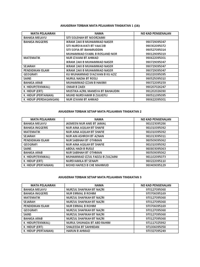 Kategori Terbaik Setiap Mata Pelajaran Tingkatan