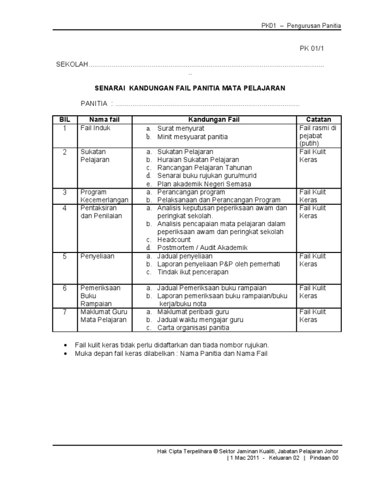 Pk01 1 Senarai Kandungan Fail Panitia