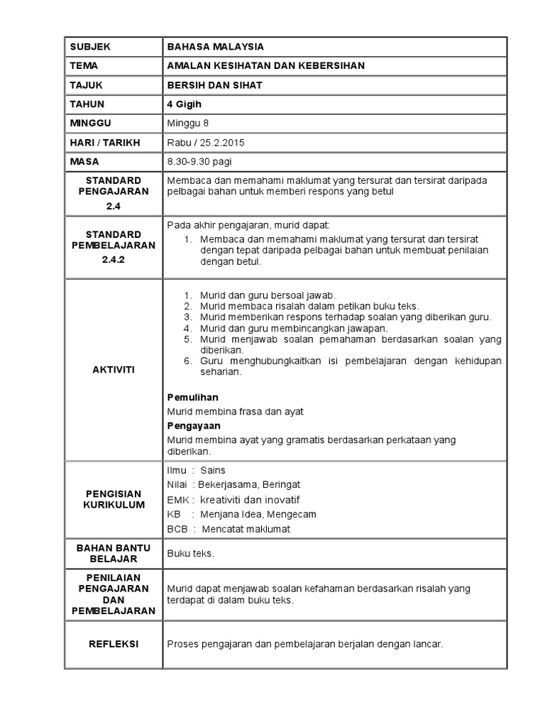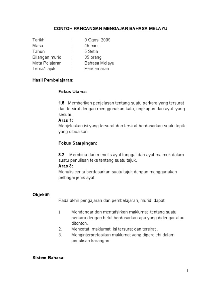 Contoh Rancangan Mengajar Bahasa Melayu
