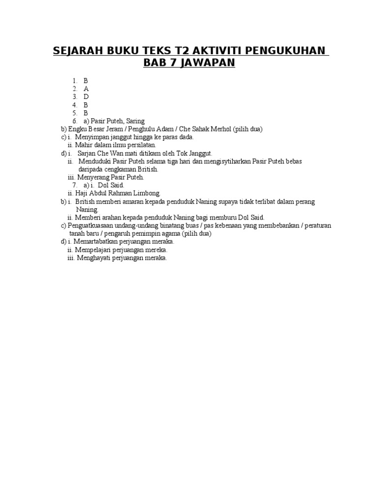 Sejarah Buku Teks Tingkatan 2 Aktiviti Pengukuhan Bab 7 Jawapan