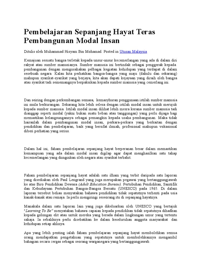 Kepentingan pembelajaran sepanjang hayat esei stpm bahasa melayu pembelajaran sepanjang hayat ialah konsep pendidikan yang amat penting dalam pembangunan diri manusia. Kepentingan pembelajaran sepanjang hayat. Academia edu is a platform for academics to share research papers. Pendidkan sepanjang hayat menekankan kepada proses pembelajaran kendiri dan bukanny proses pengajaran halini bererti bahan bahan dan pedagogi yang digunakan adalah sesuai dan mesra pelajar selain itu waktu belajar perlu juga fleksibel dan kurikumnya sesuai dengan kemajuan teknilogi dan keperluan semasa.