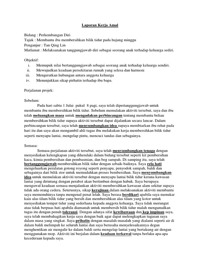 Cadangan kerja amal bidang perkembangan diri pelajar hanya perlu jalankan 1 aktiviti sahaja pelajar boleh buat kerja amal ini di mana mana sahaja yang berkenaan nilai kerajinan. Sebagai seorang anak yang bertanggungjawab saya telah membuat keputusan supaya mengemas bilik saya setiap minggu. Ah beng pelajar. Membantu ibu membuat kerja rumah tindakan ini dapat meringankan beban ibu sebagai anggota keluarga saya telah melaksanakan tanggungjawab ini untuk mengemas bilik tidur sendiri saya juga memberikan kerjasama kepada anggota keluarga supaya menjaga keamanan sebelum bermula mengemas bilik tidur saya menyumbang idea tentang.